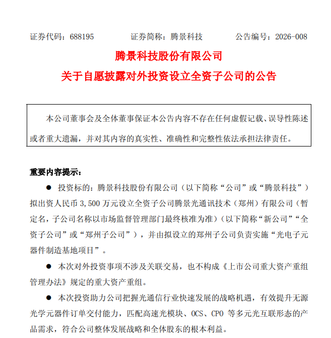光纤光缆行业网讯 腾景科技股份有限公司(腾景科技)于2026年3月9日召开第三届董事会第三次会议,审议通过了关于设立全资子公司的议案。根据公告,腾景科技拟出资人民币3500万元,在河南省郑州航空港经济综合实验区设立全资子公司“腾景光通讯技术(郑州)有限公司”(暂定名),并由该子公司负责实施“光电子元器件制造基地项目”。
