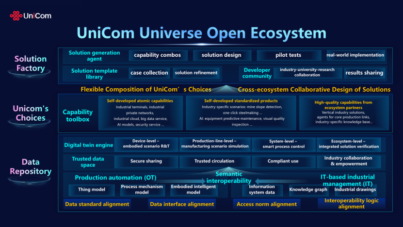 Universe生态开放平台是中国联通迈向“融合创新星辰大海”的重要实践,标志着企业生态合作模式由“能力叠加”向“体系协同”升级。平台以可信数据空间为基础,打通OT与IT数据语义壁垒,聚合连接、算力、服务、安全等原子能力及生态伙伴优质能力,构建可复制、可推广的行业解决方案模板库,形成开放共享、协同创新的生态体系。