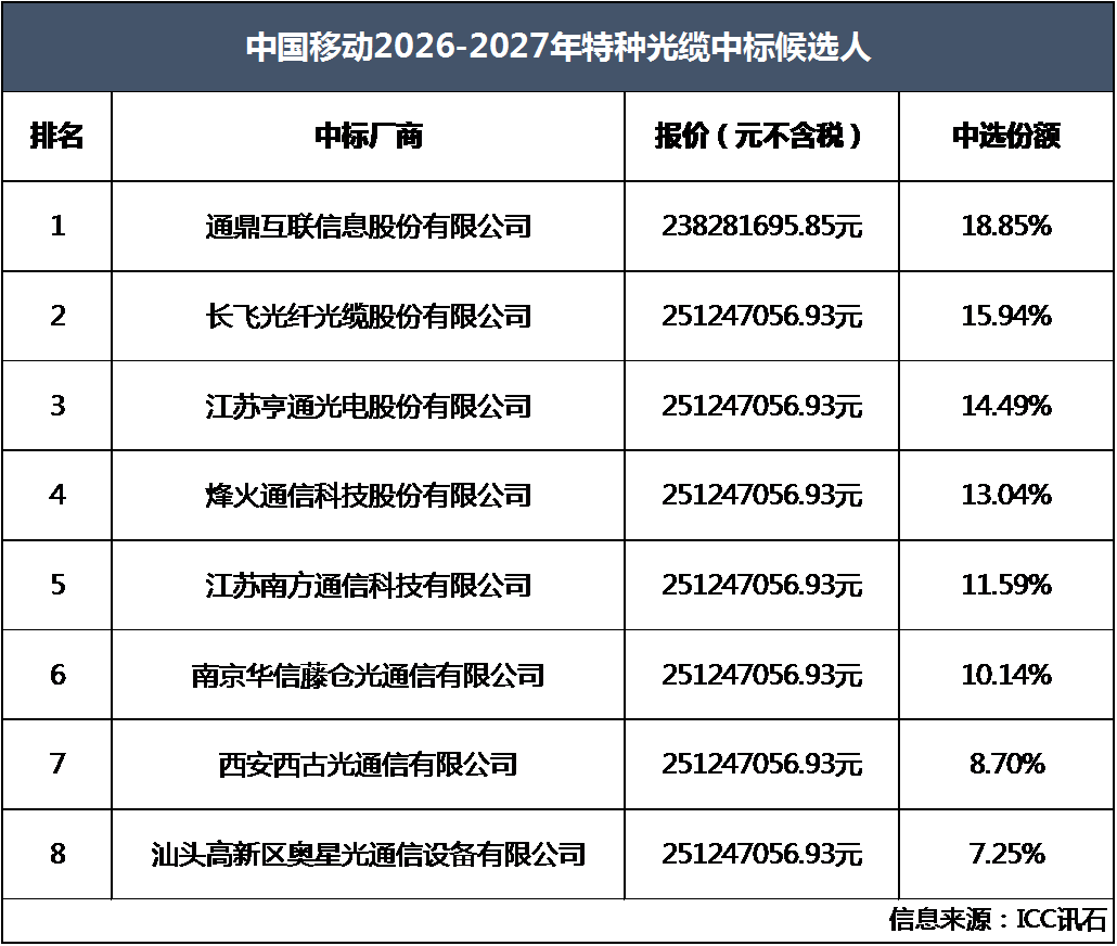 中国移动发布2026-2027年特种光缆集中采购中标候选人结果,通鼎互联、长飞光纤、亨通光电、烽火通信等8家厂商入选。中标厂商排名和报价如下: