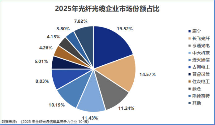 2025年,长飞光纤的全球市占率达14.57%,位居全球第二,国内第一。