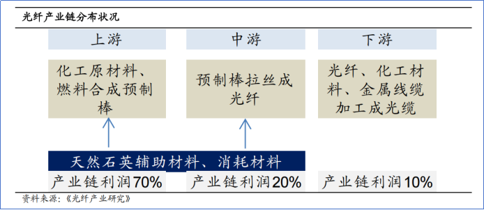 光纤光缆的产业链层次可分为三层:上游是化工原料及光纤预制棒;中游为光纤拉丝;下游为光缆生产。