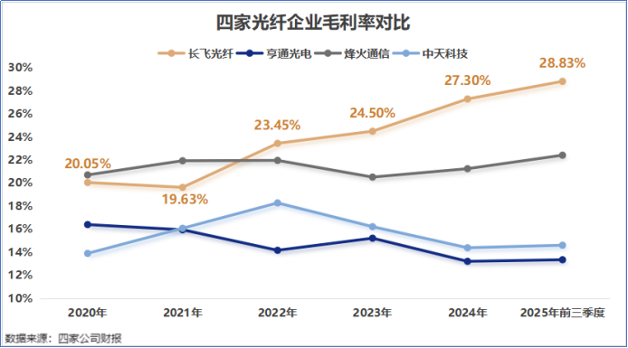2020-2025年前三季度,长飞光纤的毛利率从20.05%一路上升到28.83%,明显高于亨通光电、烽火通信、中天科技等竞争对手。