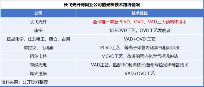 长飞光纤是国内第一家拥有光纤预制棒生产能力的公司,同时也是全球唯一一家同时掌握PCVD、OVD、VAD三大主流技术的企业。