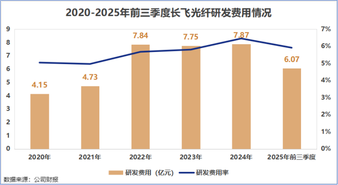 2025年前三季度,长飞光纤的研发费用为6.07亿元,同比增长8.61%,研发费用率为5.91%,相比之下,亨通光电为3.27%、中天科技为3.97%。