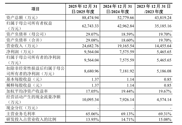 财务方面,于2023年度、2024年度、2025年度,公司实现营业收入约为1。45亿元、1。92亿元、2。47亿元人民币;同期,净利润分别为5465。65万元、7575。59万元、9564。04万元人民币。