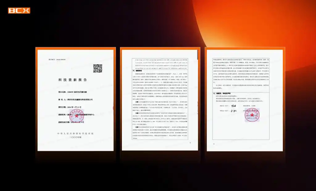 2026年2月,宝辰鑫10000WMOPA高功率脉冲光纤激光器,经过权威机构广州市科技查新咨询中心进行国内外查新,结果表明,经过文献检索,未见国内外有集成宝辰鑫MOPA万瓦产品技术特点的文献报道,该研究成果具有新颖性。