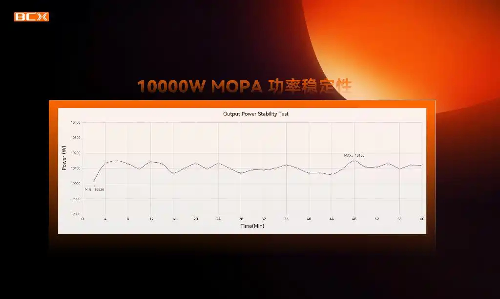 在产品开发过程中,宝辰鑫不仅关注功率指标的突破,更注重系统的综合性能与稳定可靠。因此,MOPA10000W激光器在光束质量、稳定性等核心性能指标上均进行了系统性优化:短时功率稳定性(1H)控制在±1%以内,光束参数积≤45mm×mrad,以极致性能为激光器在工业场景下的长期稳定运行提供支撑,可满足高端制造领域对工艺一致性与加工质量的严苛要求。