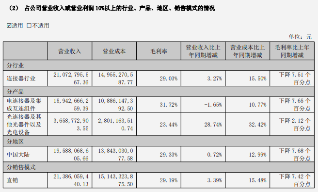 在地域分布上,公司光连接器业务的增长也受益于海外市场的拓展。2025年,公司港澳台及其他国家和地区收入达17.98亿元,同比增长45.28%,占总营收的比重提升至8.41%,远高于中国大陆市场0.72%的增速。