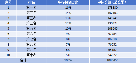 项目中标人数量为10个,对于中标份额如表所示: