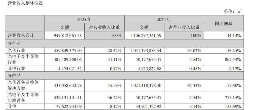 报告期内,核心增长亮点来自光电子及半导体业务。2025 年公司完成对全球领先设备制造商 ficonTEC 的收购并顺利并表,该业务全年实现营收4.855亿元,同比大幅增长867.54%,有效对冲了光伏业务的下滑压力。ficonTEC 在硅光器件精密组装与测试领域技术领先,已切入英伟达、Intel、台积电等全球顶尖企业供应链,其可插拔光模块封装设备获得大额订单,CPO 相关量产设备完成验证并实现批量化订单,OCS 领域也斩获瑞士头部客户产线订单,截至报告期末光电子及半导体业务在手订单达 11.05 亿元。