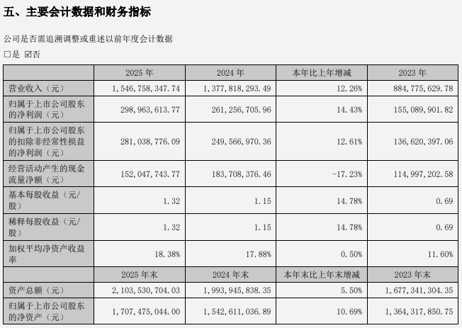 2025年,公司实现归属于上市公司股东的净利润2.99亿元,同比增长14.43%。基本每股收益为1.32元,同比增长14.78%。加权平均净资产收益率为18.38%,较上年提升0.50个百分点。