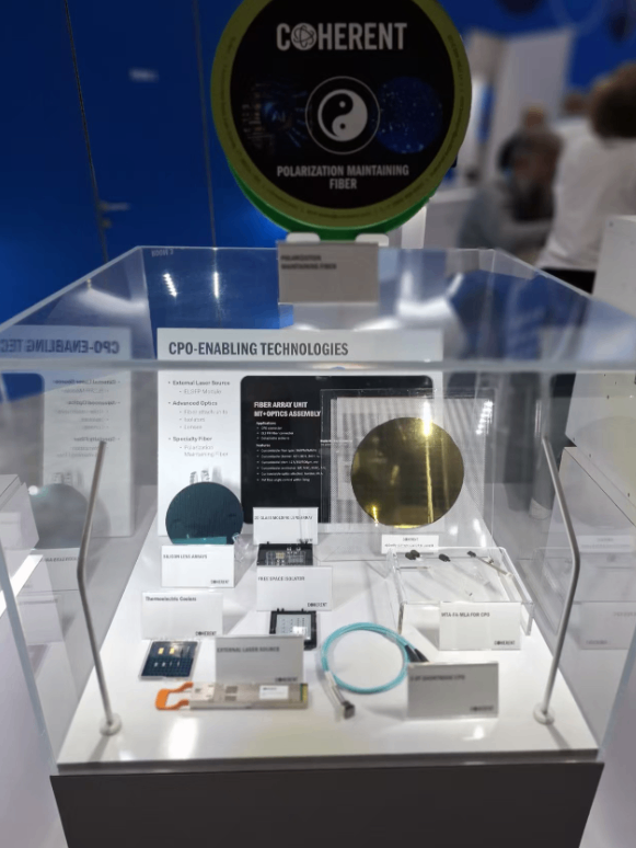 今年OFC还有一个有趣的地方,就是许多器件级别公司都有CPO的方案展示,类似之前OZOptics那些量子通信,光纤传感的方案演示。Coherent的展台应该是最有代表性的。但是有点可惜的是,他们展示的CPO方案里面无非就是连接器,隔离器,透镜这些分量很轻的东西,分量最重的要算激光器芯片,CPO的核心毕竟不在他们手里。说实话我感觉这些展示有点牵强。TSMC看到这些会说什么?