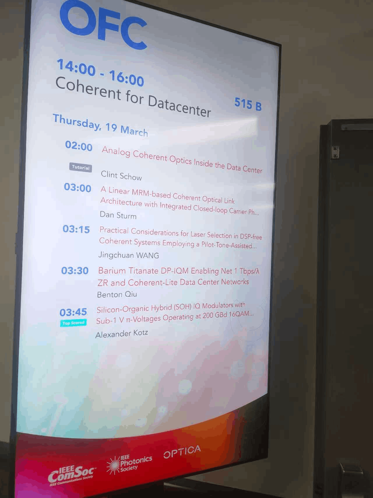 OFC上对相干技术的讨论集中在用相干通信来做AI的ScaleAcross,类似于云计算时代的DCI。在AI整体上开始从训练向推理应用转型的当口,AI光连接也开始走向分布式。虽然不知道这样的趋势在现实中如何,不妨碍学者们对此进行热烈讨论。不同于DCI时代的相干技术,这一次讨论的重点似乎更关注延迟。许多文章的主题都是降低或者控制延迟,想必这和现在相干通信必不可少的DSP有关吧。