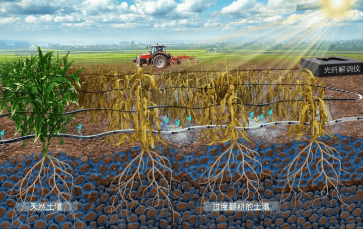 这项技术还能“诊断”出不同耕作方式对土壤的改造痕迹。在传统频繁翻耕的区域,光纤数据显示,短暂的降雨导致水分淤积在浅表层难以渗透,随后又迅速蒸发散失。同时,农具的重压加速了浅层土壤的毛细抽水作用,加剧了水分流失。而在免耕或人为干扰较少的土壤中,水分能够迅速向下渗流并储存起来,像海绵一样为作物根系稳定供水。