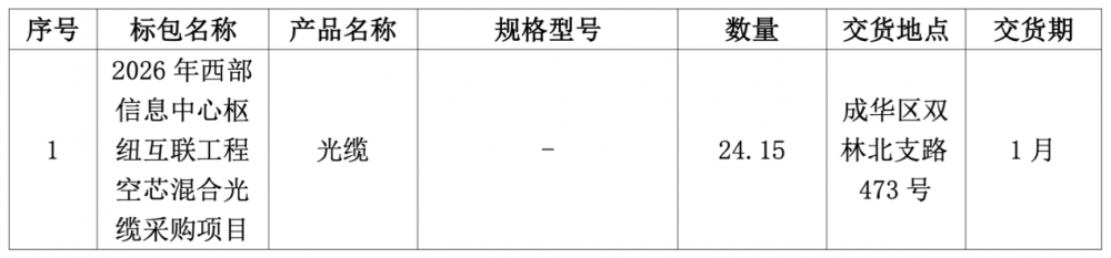 4月10日消息(水易)来自中国电信阳光采购网消息,中国电信成都分公司2026年西部信息中心枢纽互联工程空芯混合光缆采购项目正式启动,预估规模为1937554.50元(含税)。