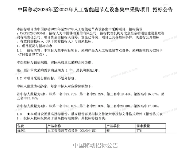 据中国移动采购与招标网公示信息,中国移动2026-2027年人工智能超节点设备集中采购项目已于4月8日完成开标,正式发布中标候选人公示。本次集采是国内运营商在集团层面首次启动的AI超节点设备规模化集中采购,且项目全量指定采用华为CANN生态方案,成为国内自主算力基础设施建设的标志性动作。