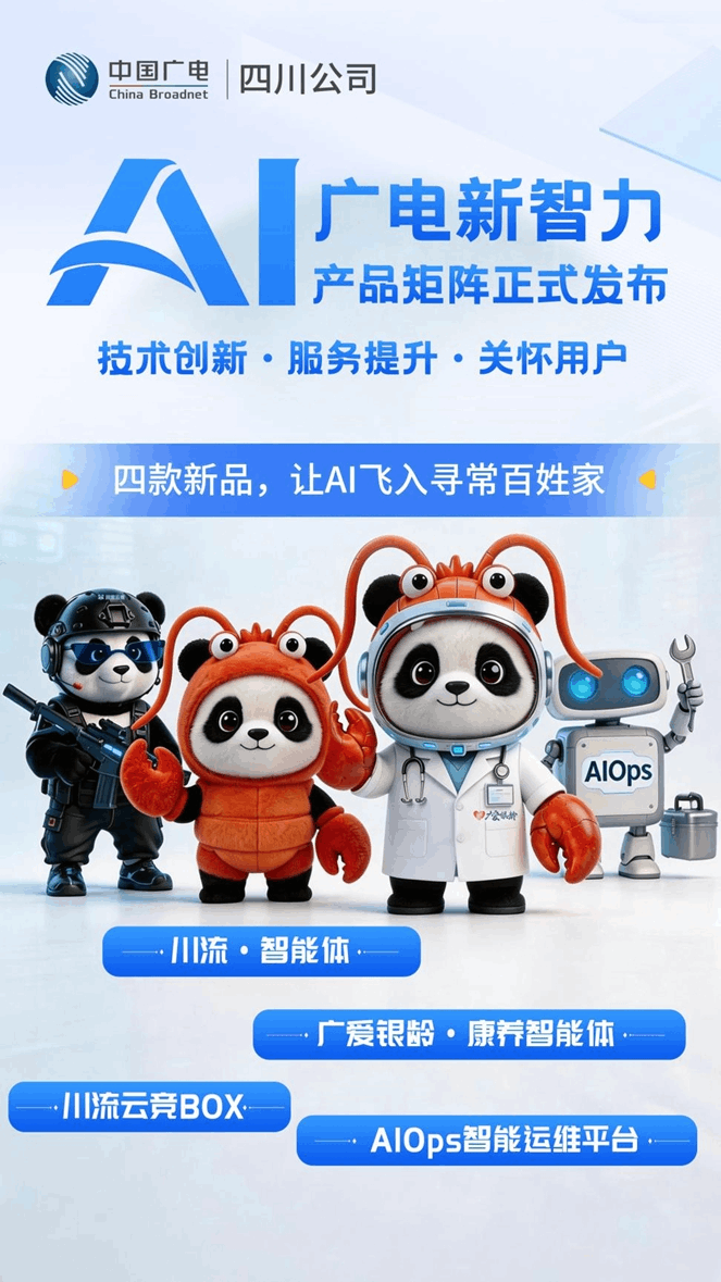 2026年4月14日,中国广电四川公司在第十三届中国网络视听大会上正式发布四款自主研发的AI产品——川流·智能体、广爱银龄·康养智能体、川流云竞BOX及AIOps智能运维平台。这是四川广电网络在人工智能领域的系统性战略布局,也是“技术创新+服务创新”双轮驱动战略的集中落地。