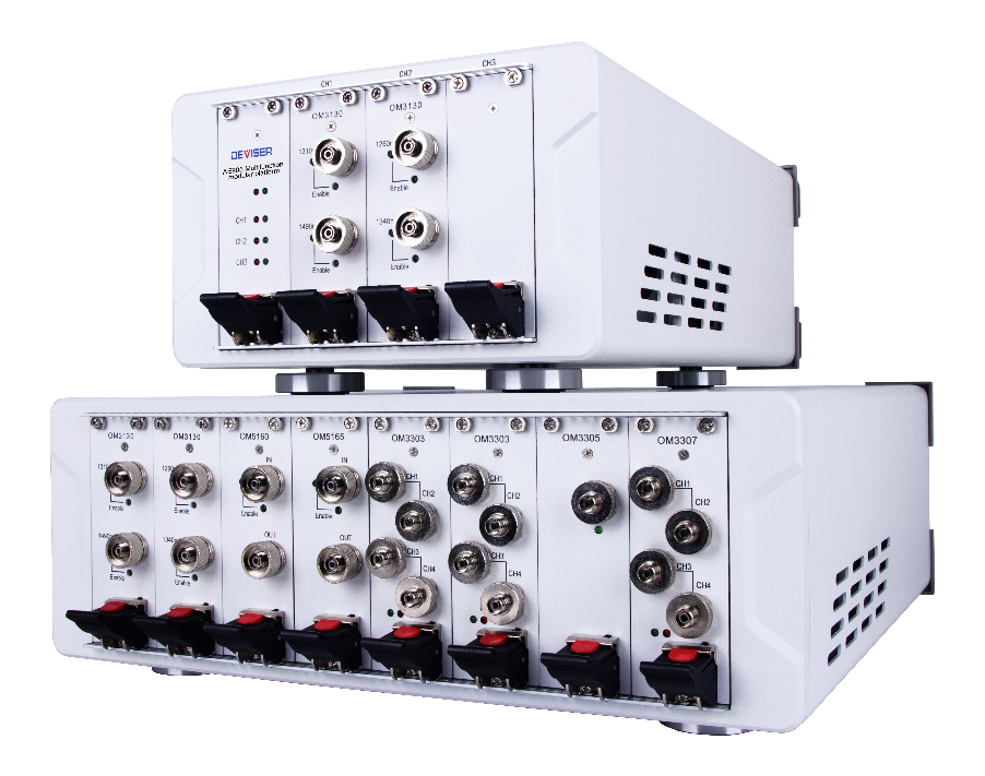 AE908高性能光万用表作为模块化插卡式的综合测试平台,设有8个功能卡槽,可自由搭载多种光测量模块,灵活搭建适配客户需求的测试系统。该产品支持以太网控制,具备准确度高、稳定性好、响应快、易操作等优势,十分适用于光模块、光器件的设计及量产测试工作。