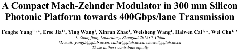 上海张江实验室的研究人员在300毫米硅基光电子平台上制造了一款紧凑型马赫-曾德尔调制器,在应对这些挑战方面取得了显著进展。该器件实现了优异的性能指标,包括94.7GHz的中位电光带宽、仅2.4dB的中位插入损耗,以及使用PAM-8调制格式成功实现400Gbps传输,所有这些性能均在500微米的超紧凑尺寸内实现[1]。