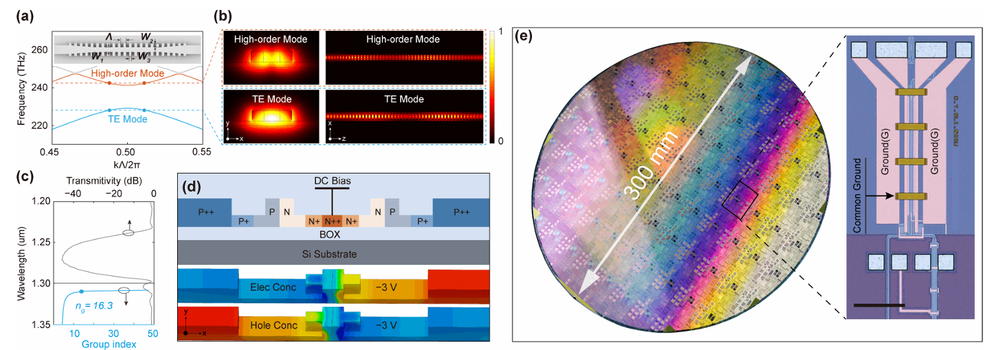 图1:慢光调制器的完整设计架构,包括光子能带曲线、TE模式的电场分布、1310nm波长处的群折射率特性、具有掺杂分布的横向p-n二极管相移器截面图,以及制造完成的300mmSOI晶圆和调制器器件的照片。