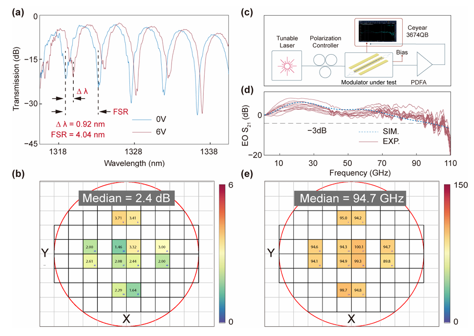图2:全面的表征结果,包括显示插入损耗性能的静态透射谱、展示整个晶圆2.4dB中位插入损耗的晶圆级测量统计数据、电光带宽测试的实验装置示意图、测量的电光S21频率响应曲线,以及显示优异均匀性的晶圆级3dB带宽测量分布(中位值为94.7GHz)。