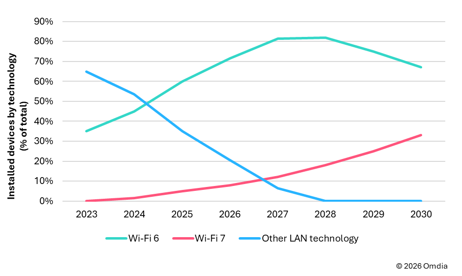 根据Omdia此前发布的《2025–2030年消费者宽带CPE存量预测报告》,美国市场的Wi-Fi7采用率预计将从2025年占全部存量设备的10%增长至2030年的30%以上(见图1)。然而,根据FCC公布最新相关准则,新型Wi-Fi7产品进入市场的难度将有所增加。因此,Wi-Fi7的实际普及率恐将远低于上述预测值;而当Wi-Fi8问世之时,它或许会直接取代Wi-Fi7成为市场上的“高端技术”标杆,而非让Wi-Fi7技术下沉普及至低资费套餐的用户群体中。