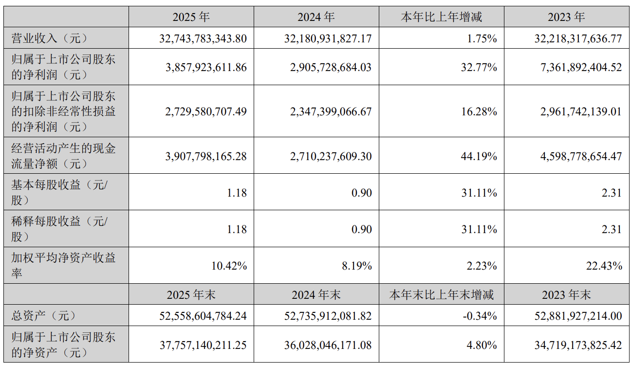 上周五,大华股份发布2025年年度报告。报告期内,公司实现营业收入327.44亿元,比上年同期增长1.75%;实现归属于上市公司股东的净利润38.58亿元,比上年同期增长32.77%;扣除非经常性损益后的净利润为27.30亿元,同比增长19.63%。