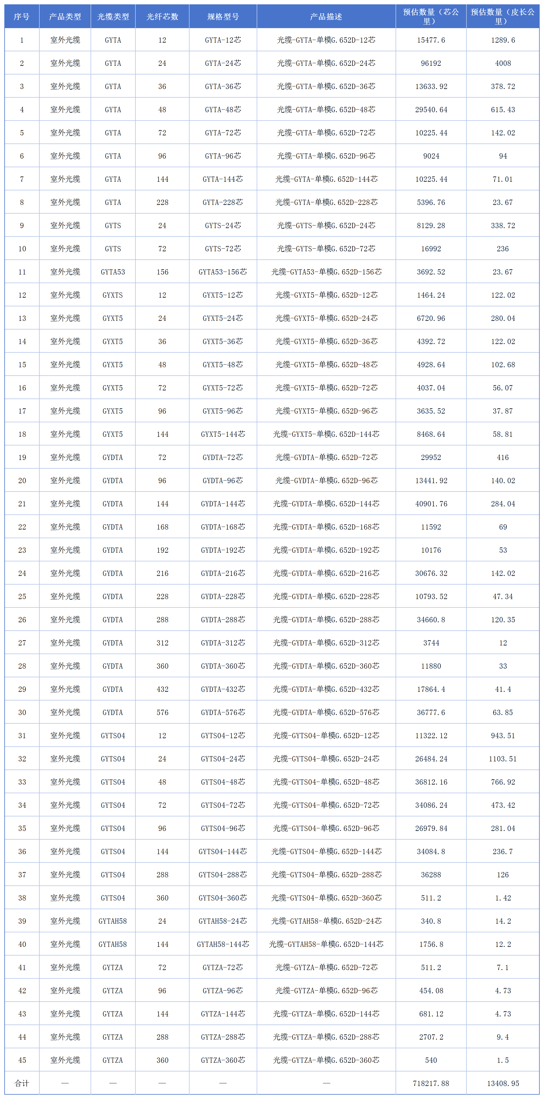 本项目不划分标包,采购产品为光纤、光缆,预估数量为13408.95皮长公里,具体规格型号如表所示: