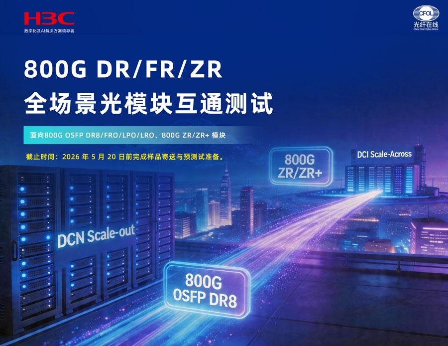为加速800G高速光互连技术商用落地、完善多厂商设备兼容性标准,CFCF2026光连接大会正式宣布与新华三集团达成合作,全面启动面向AI智算与数据中心互联(DCN&DCI)场景的800GDR/FR/ZR系列光模块互通测试,重点覆盖数据中心内部Scale-out与跨域DCIScale-Across两大核心应用场景,推动800G光互连生态成熟,并推进800G创新方案的演示。