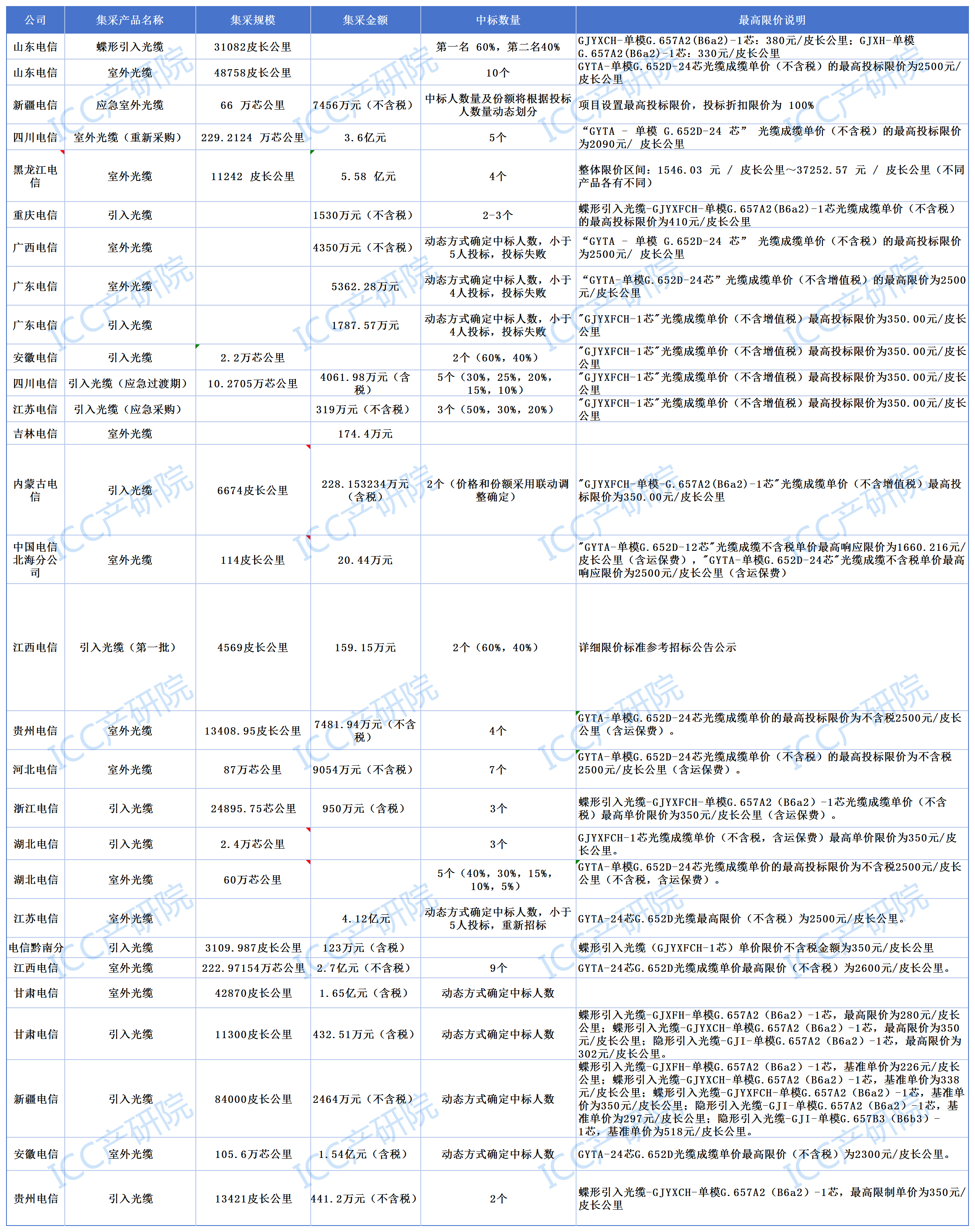 整体而言,本轮中国电信各省公司光缆集采的主导行情已非常清晰:室外光缆GYTA-24芯G.652D的最高限价普遍锚定2500元/皮长公里,引入光缆GJYXFCH的最高限价普遍锚定350元/皮长公里。各省在规模统计口径、金额预算和具体限价上虽存有差异,但基准价格高度趋同,反映出集团层面或市场竞争形成的价格指导效应。