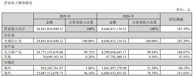 光纤光缆行业网讯 4月24日,成都新易盛通信技术股份有限公司披露了2025年年度报告及2026年第一季度报告。报告显示,2025年度公司实现营业收入248.42亿元,较上年同期的86.47亿元增长187.29%;归属于上市公司股东的净利润为95.32亿元,较上年同期的28.38亿元增长235.89%;扣除非经常性损益后的净利润为95.07亿元,同比增长235.97%。