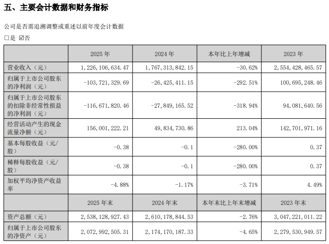 截至2025年末,公司资产总额为25.38亿元,较上年末下降2.76%;归属于上市公司股东的净资产为20.73亿元,下降4.65%。