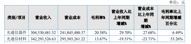 公司两大业务板块表现分化。光通信器件业务实现收入3.05亿元,同比增长29.70%,毛利率为20.58%,较上年提升6.49个百分点。光通信材料业务实现收入3.42亿元,同比下降19.51%,毛利率为13.67%,较上年提升53.26个百分点。