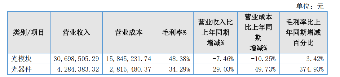 收入构成方面,公司主营业务收入3498.29万元,其中光模块收入3069.85万元,同比下降7.46%,毛利率为48.38%;光器件收入428.44万元,同比下降29.03%,毛利率为34.29%。按地区划分,国内主营业务收入2743.45万元,同比下降13.62%,毛利率为43.68%;国外主营业务收入754.84万元,同比增长1.35%,毛利率为57.46%。