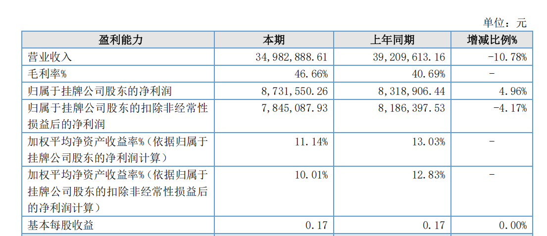 从盈利能力指标看,公司2025年毛利率为46.66%,较上年同期的40.69%提升5.97个百分点。加权平均净资产收益率(依据归属于挂牌公司股东的净利润计算)为11.14%,上年同期为13.03%。截至2025年12月31日,公司总资产为8201.23万元,较上年末增长13.47%;归属于挂牌公司股东的净资产为7469.94万元,同比增长13.24%;归属于挂牌公司股东的每股净资产为1.48元,较上年末的1.64元下降9.76%。