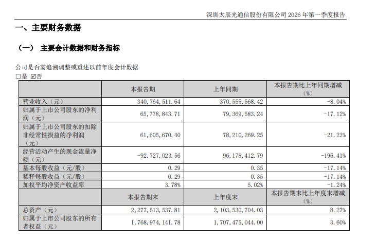 光纤光缆行业网讯 深圳太辰光通信股份有限公司(300570)于4月28日披露2026年第一季度报告。报告显示,公司一季度实现营业收入3.41亿元,同比下滑8.04%;归属于上市公司股东的净利润为6577.88万元,同比下降17.12%;扣除非经常性损益后的净利润为6160.57万元,降幅达21.23%。基本每股收益0.29元,同比减少17.14%。