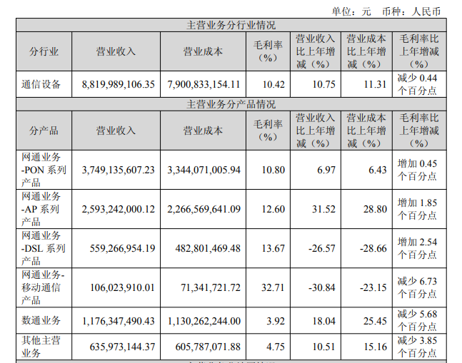 从业务结构看,境外业务成为增长的重要驱动力。2025年,公司境外主营业务收入达62.01亿元,同比增长43.08%,占总主营业务收入的70.31%。分产品来看,网通业务中的PON系列产品仍是收入占比最高的品类,实现收入37.49亿元,占总收入的42.51%;AP系列产品收入增长超过30%,达25.93亿元。此外,数通业务收入为11.76亿元,其他主营业务(含汽车电子、清洁及家居机器人)收入为6.36亿元。