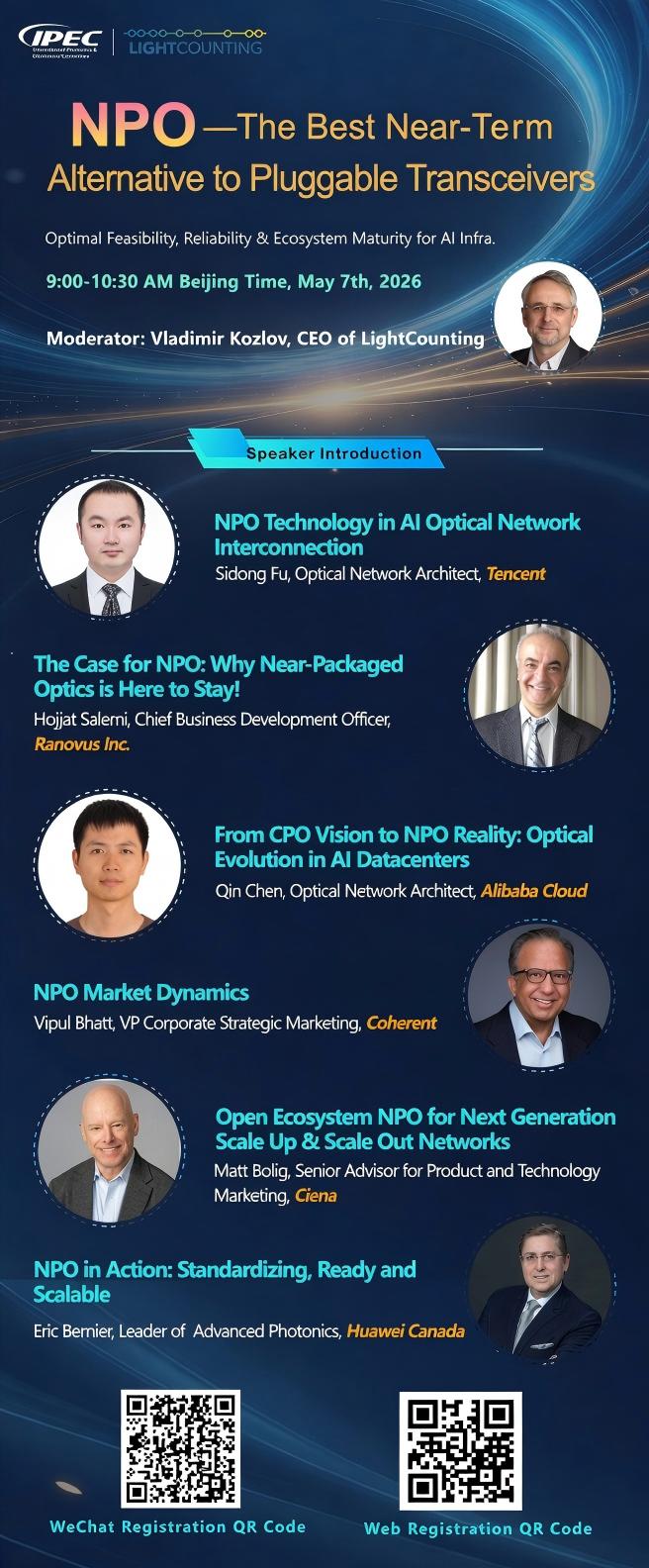 在AI算力扩容与高速光互联技术升级的双重驱动下,NPO已成为2026年光通信产业的重要发展方向,并赢得了全球CSP厂商广泛关注与落地探索。本次线上论坛由IPEC携手LightCounting联合主办,将于北京时间5月7日9:00–10:30准时开播。活动汇聚腾讯、Ranovus、阿里云、Coherent、Ciena、华为等全球头部企业顶尖技术专家与行业领袖,立足AI算力集群高速互联刚需,聚焦NPO技术价值、落地路径、产业痛点与商业化机遇,围绕下一代近封装光学技术生态建设、标准协同、场景规模化应用等核心议题展开多维深度研讨。