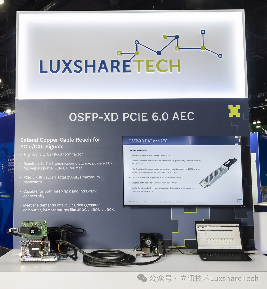 此外,立讯技术还展出了全新的OSFP-XDPCIe6.0AEC产品,为数据中心解耦计算架构升级提供核心支撑。该产品采用高密度OSFP-XD封装,专为延长PCIe与CXL信号的铜缆传输距离设计,搭载Marvell®Alaska®PPCIe6.0重定时器后,传输距离可达7米,支持PCIe6x16规格,总最大带宽高达256GB/s,可完美适配JBOG、JBOM、JBOX等演进式解耦计算架构,灵活满足机架间、机架内的连接需求,助力数据中心实现架构升级与性能提升。