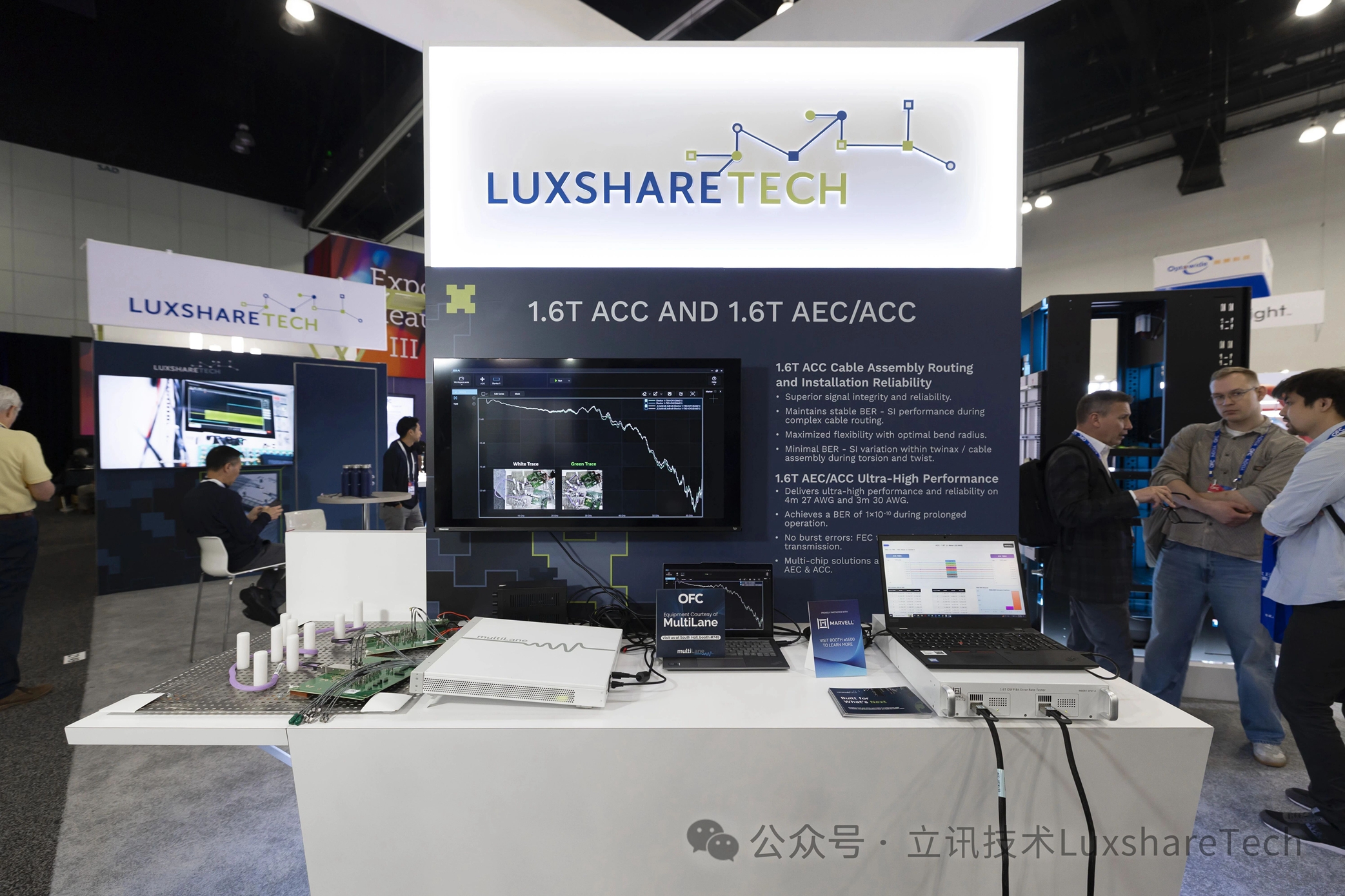 针对数据中心柜内及柜间的中长距离互连需求,立讯技术展出了1.6TbpsOSFPAEC及1.6TbpsOSFPACC两款高速互连方案,实现了传输距离与运行稳定性的双重兼顾。其中1.6TbpsOSFPAEC可在4米27AWG、3米30AWG传输距离内保持稳定运行,能灵活适配不同规模AI数据中心的布线布局;1.6TbpsOSFPACC则在平衡功耗与传输长度的基础上,重点优化了线缆组件的布线与安装可靠性,即便在复杂布线、扭转扭曲等严苛工况下,仍能保持稳定的信号完整性,误码率(BER)波动控制在极小范围,兼顾安装灵活性与传输稳定性,为高密数据中心的布线部署提供了高效解决方案。