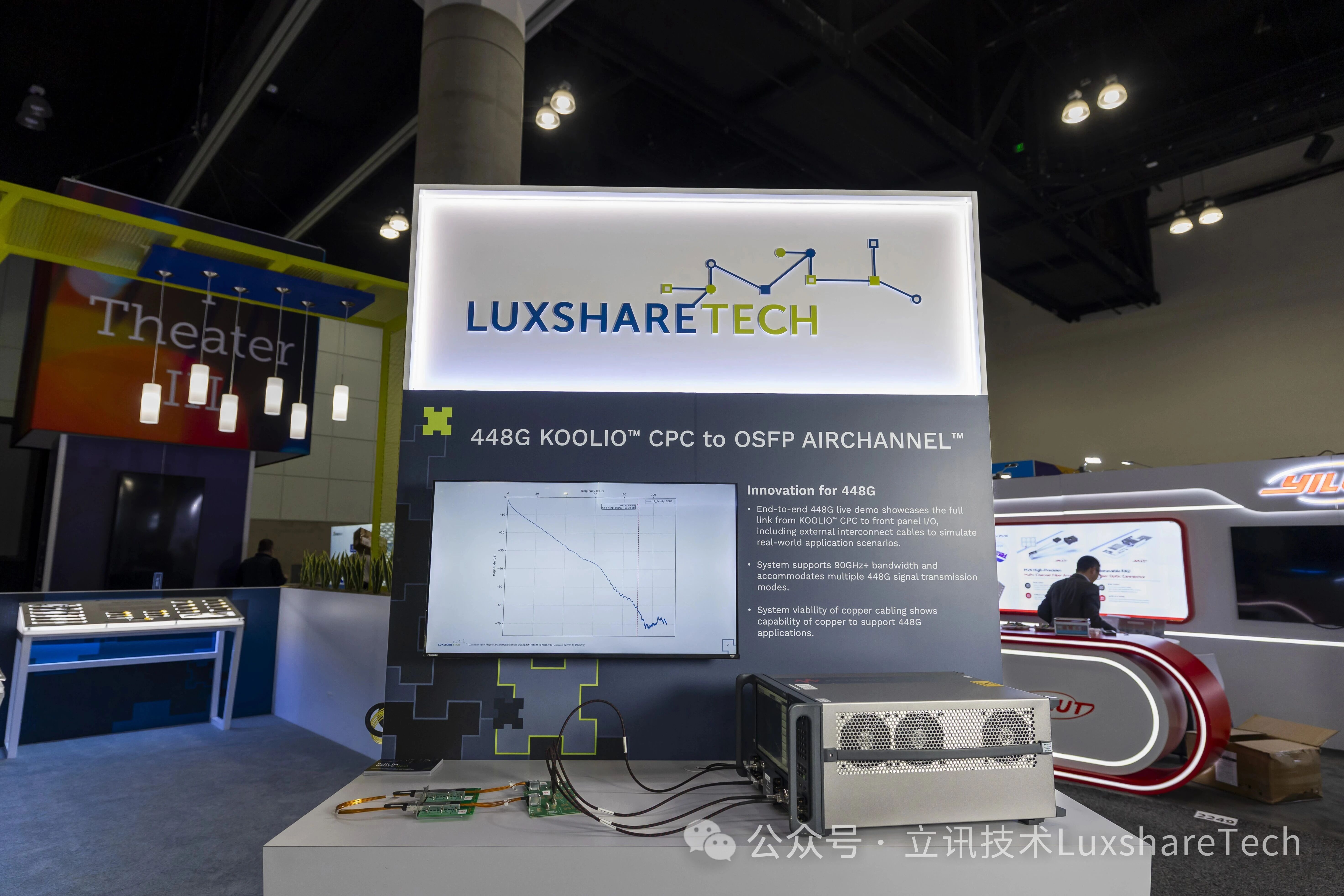 在持续深耕下一代超高密度光互连技术的同时,立讯技术还展出了一系列成熟的224G/448G级铜互连创新产品,以稳定、高效的全链路解决方案满足当前AI数据中心的高速互连需求,进一步完善“光铜并进、前瞻与落地协同”的布局。在448G/224G铜互连方案展区,其现场演示的448GKOOLIO™CPCtoOSFPAirchannel™端到端解决方案成为焦点,该方案完整还原从KOOLIO™CPC到面板I/O的全链路连接,支持超90GHz带宽,可兼容多种448G信号传输模式,实测性能优异,既验证了铜缆在高带宽场景的适用性,又与XPO光互连方案形成互补,充分彰显立讯光铜协同的技术实力。
